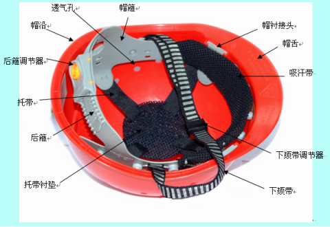 安全帽由帽殼、帽襯接頭、帽舌、吸汗帶、下頦帶調節器、下頦帶、托帶襯墊、后箍、托帶、后箍調節器、帽沿、透氣孔、帽箍組成。